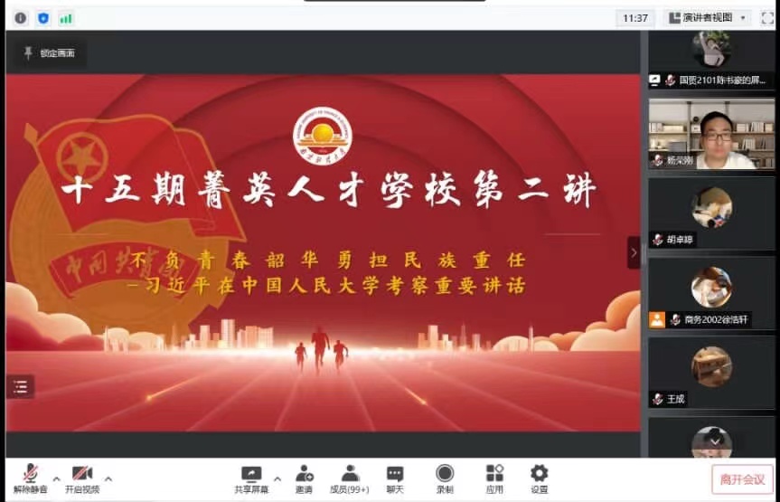 5月6日晚,我校第十五期青馬班第二講依托騰訊會(huì)議在線上順利開課。南京財(cái)經(jīng)大學(xué)馬克思主義學(xué)院楊榮剛老師擔(dān)任主講人,為同學(xué)們講授了以“不負(fù)青春韶華 勇?lián)褡鍙?fù)興重任——習(xí)近平在中國(guó)人民大學(xué)考察時(shí)的重要講話”為主題的公開課。