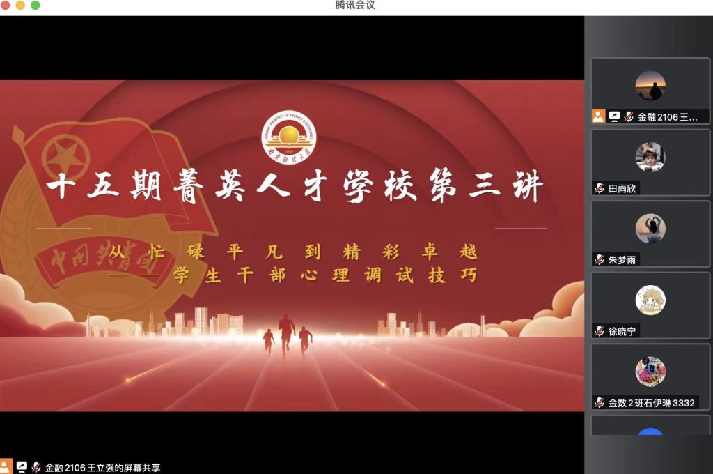 5月13日晚,我校第十五期青馬班第三講依托騰訊會(huì)議在線上順利開課。南京財(cái)經(jīng)大學(xué)學(xué)生處心理健康教育與咨詢中心主任吳垠老師擔(dān)任主講人,為同學(xué)們講授了以“從忙碌平凡到精彩卓越——學(xué)生干部心理調(diào)試技巧”為主題的公開課。