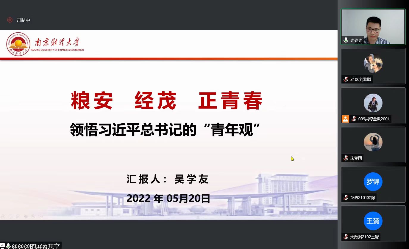 5月20日晚,我校第十五期青馬班第四講依托騰訊會(huì)議在線上順利開(kāi)課。南京財(cái)經(jīng)大學(xué)食品與工程學(xué)院吳學(xué)友老師擔(dān)任主講人,為同學(xué)們講授了以“糧安 經(jīng)茂 正青春——領(lǐng)悟習(xí)近平總書(shū)記的青年觀”為主題的公開(kāi)課。