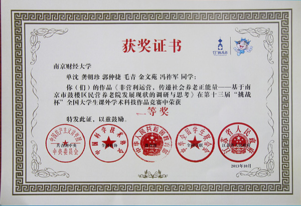 近日,由共青團中央、中國科協(xié)、教育部、全國學(xué)聯(lián)、江蘇省人民政府主辦,蘇州大學(xué)和蘇州工業(yè)園區(qū)管委會共同承辦的第十三屆“挑戰(zhàn)杯”全國大學(xué)生課外學(xué)術(shù)科技作品競賽決賽在蘇州市落下帷幕。通過作品展示、評委問詢及競賽評審委員會認(rèn)真、細致、公平、公正的評審,我校參賽的兩件作品獲獎,其中,《非營利運營,傳遞社會養(yǎng)老正能量——基于南京市鼓樓區(qū)民營養(yǎng)老院發(fā)展現(xiàn)狀的調(diào)研與思考》(指導(dǎo)老師:張國軍,成員:單沈、龔朝珍、郭仲捷、毛青、金文苑、馮祚軍)獲一等獎,《誰動了我的畢業(yè)實習(xí)權(quán)益?——基于南京市仙林地區(qū)高校學(xué)生的調(diào)研報告》(指導(dǎo)老師:焦富民、陳紅梅,團隊成員:戴羽平、范地偉、許丹丹、李孟雪、許婷、夏洋)獲三等獎。我校在入圍全國決賽的27所財經(jīng)類高校中名列前茅,這也是我校自參加該項賽事以來取得的最佳成績,實現(xiàn)了該項賽事成績的歷史性突破。