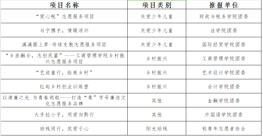 根據(jù)《關(guān)于開展南京財(cái)經(jīng)大學(xué)第二屆“藍(lán)經(jīng)靈”志愿服務(wù)項(xiàng)目大賽的通知》要求,經(jīng)學(xué)院推薦、專家評審,遴選出以下9個(gè)項(xiàng)目晉級決賽(還有1個(gè)決賽名額將通過外場投票產(chǎn)生),現(xiàn)將名單公示如下: