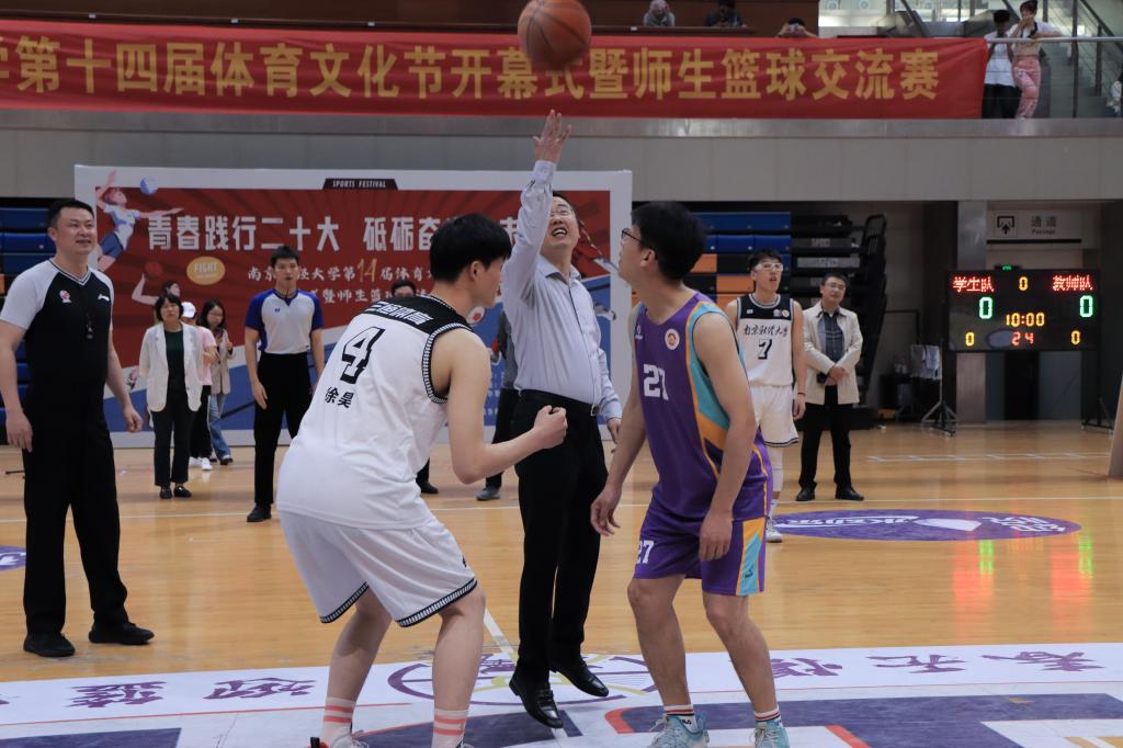 表演結(jié)束后,師生籃球交流賽開始,趙國棟副校長為比賽開球。