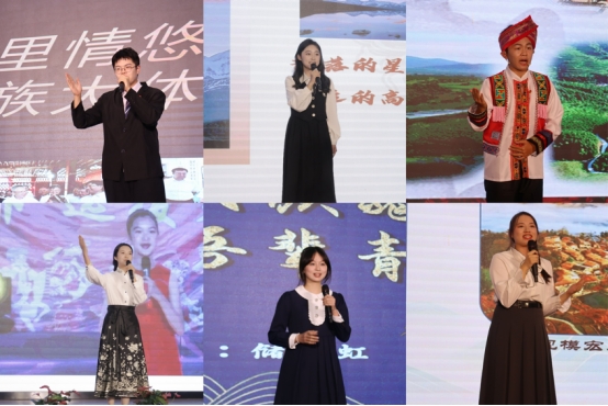 經(jīng)過初賽、復(fù)賽的層層選拔,十名選手來到了決賽的舞臺。來自新疆的國貿(mào)2301班的曾佳儀將家鄉(xiāng)作為江蘇對口支援地區(qū)接受援 助的故事娓娓道來,表示我們南財學(xué)子也要接過民族團(tuán)結(jié)的接力棒,以黨的二十大精神為指引,鑄牢中華民族共同體意識,為強(qiáng)國建設(shè)、民族復(fù)興貢獻(xiàn)力量;初入大學(xué)的管理科學(xué)2301王瑞雪講述了自己的爺爺在少數(shù)民族修渠的故事,道出愛國之心是連接家與家、家與國之間的紐帶的理解;在湘西地區(qū)土生土長物聯(lián)網(wǎng)2301班的曾思融,向大家展示了家鄉(xiāng)麻陽苗族自治縣滕代遠(yuǎn)紀(jì)念館與自己的故事,家鄉(xiāng)老路的變化更讓他感受到了民族團(tuán)結(jié)的力量;說著貴州方言、唱著山歌上場的法學(xué)2302班羅菁英帶領(lǐng)所有評委和觀眾游覽了貴州特色,在她的介紹里,貴州呈現(xiàn)出極具民族特色的一番景象,充滿著對家鄉(xiāng)驕傲的同時,她爭做新時代的奮斗先鋒……隨后,陪伴選手一路過關(guān)斬將的演講小導(dǎo)師及PPT小導(dǎo)師在每位選手演講結(jié)束后,上場與主持人分享心得。