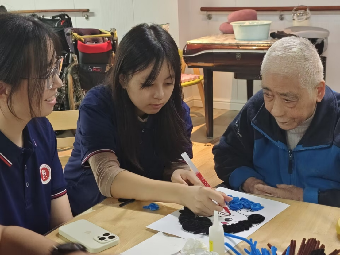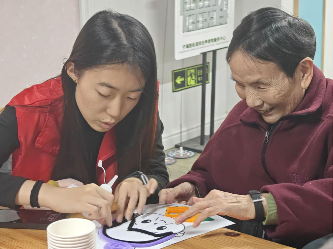圖為志愿者和老奶奶做手工 倪千惠攝