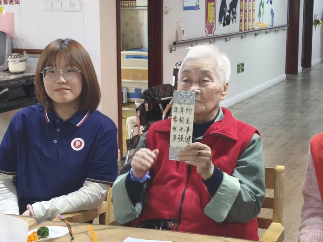 活動尾聲,志愿者為每位老人抽選精心準(zhǔn)備的書簽,并深情朗讀上面的祝福寄語,向老人們送上真摯的祝福。方寸之間,書簽不僅濃縮了文字的力量,更承載著青春的敬意與陪伴的溫情。