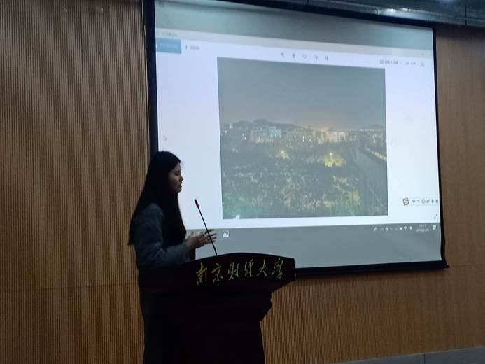 決賽現(xiàn)場馮睿同學(xué)用優(yōu)美的詞句描述了他的參賽作品,“等到秋風(fēng)起,等到紅葉滿山,遠(yuǎn)處故人,策馬而來,還是少年模樣,陪我取件人間煙火,山河遠(yuǎn)闊”。寥寥幾句,配上照片,一個(gè)靜候故人歸的女子形象躍然眼前。來自工商1801班的焦一娜同學(xué)用她的作品對“南財(cái)煙火”進(jìn)行了獨(dú)特解釋。“南財(cái)煙火”不一定是要熱鬧的,也可以是傍晚的寧靜。當(dāng)天暗下來,又是一種“南財(cái)煙火”。