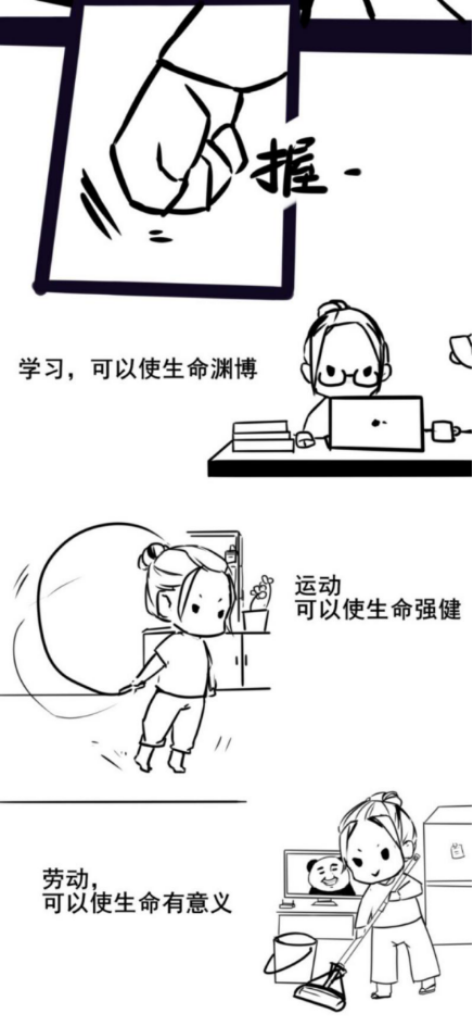遵循公平公正的原則,評選采取多人多票制,軟件工程1901班的施俊同學(xué)的作品脫穎而出,贏得了大家的青睞。他的作品采用了漫畫形式,塑造了新穎有趣,活潑可愛的動漫人物形象。由于新冠肺炎的擴(kuò)散,主人公整天宅在家中無所事事,看到前線的醫(yī)護(hù)人員們在最危險的地方與死神展開殊死搏斗,醒悟自己的生活不能這般頹廢,他開始運(yùn)動,學(xué)習(xí),做更多有意義的事情。漫畫折射了疫情間困在家中的我們的生活狀態(tài),為了讓我們自己都更有價值,我們都應(yīng)該用自己的方式活出不一樣的精彩。漫畫主題鮮明,引人眼球,從而一舉奪冠。接下來請大家欣賞這幅漫畫其中的一部分: