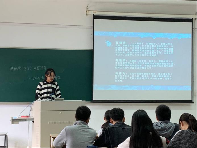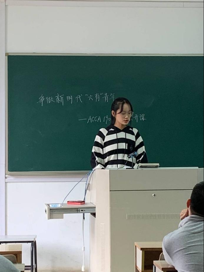10月28日上午,為介紹習(xí)近平總書(shū)記提出的“六有”青年思想,幫助同學(xué)們?cè)谛聲r(shí)代成為一名有理想有追求、有擔(dān)當(dāng)有作為、有品質(zhì)有修養(yǎng)的大學(xué)生,ACCA1901班在我校仙林校區(qū)JA210室開(kāi)展了“爭(zhēng)做新時(shí)代六有青年”的素養(yǎng)公開(kāi)課。本次素養(yǎng)公開(kāi)課共分為三個(gè)部分,由組織委員帶領(lǐng)同學(xué)們進(jìn)行學(xué)習(xí)。